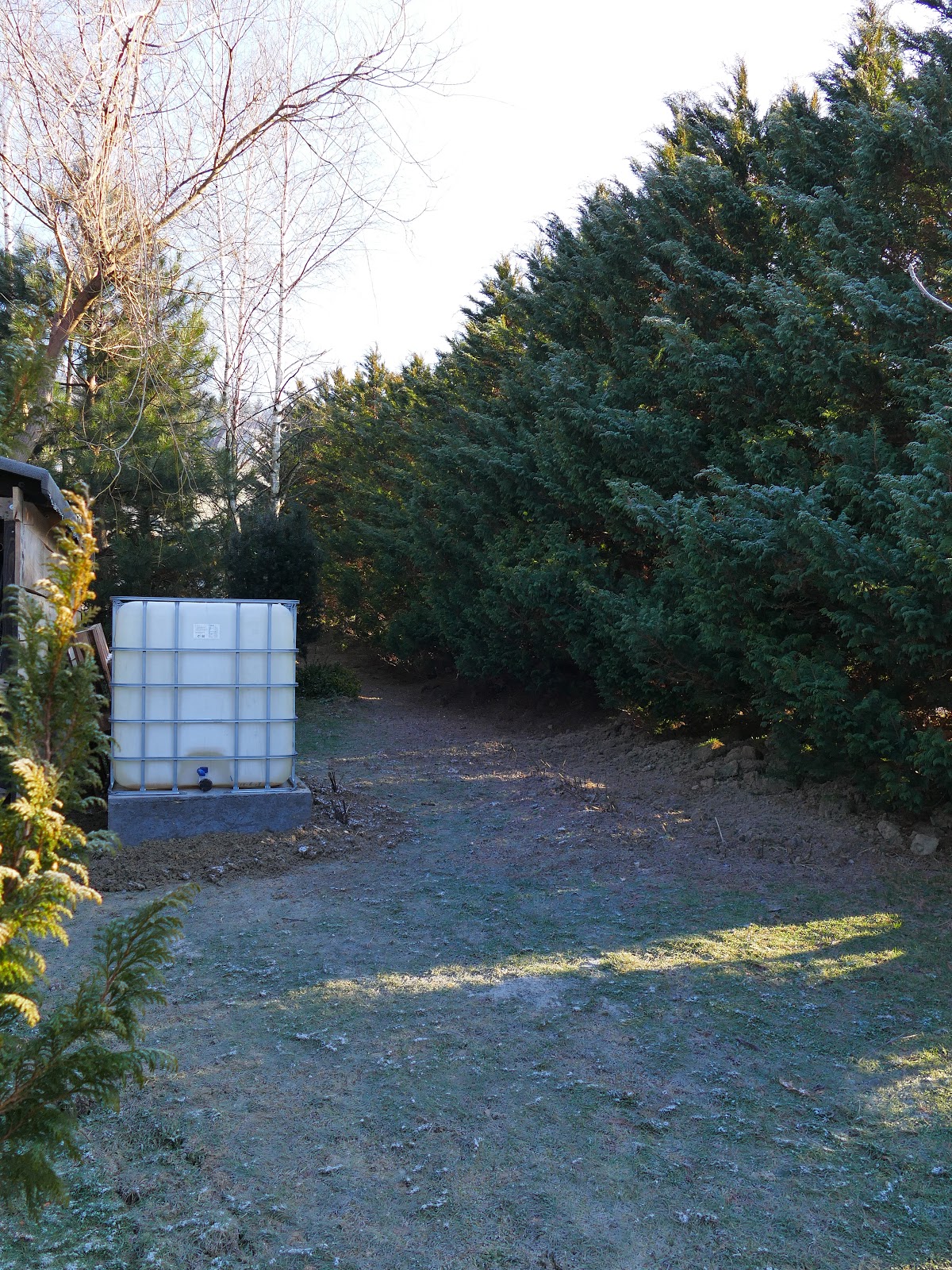 Z tyłu chatki , znajduje się lamus ( takie miejsce jest konieczne w dużym ogrodzie ) i przy nim , podobnie jak z przodu jest zbiornik , który będzie zbierał wodę , a jej nadmiar odprowadzony zostanie do stawu .