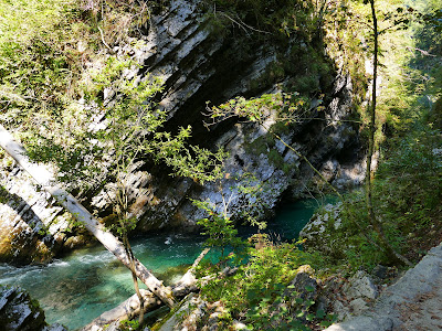Do skalnych ścian doczepione są drewniane mosty, zawieszone nad szmaragdową rzeką Radovna, którymi spaceruje się pośród bujnej roślinności, nad spienioną wodą i huczącymi wodospadami.